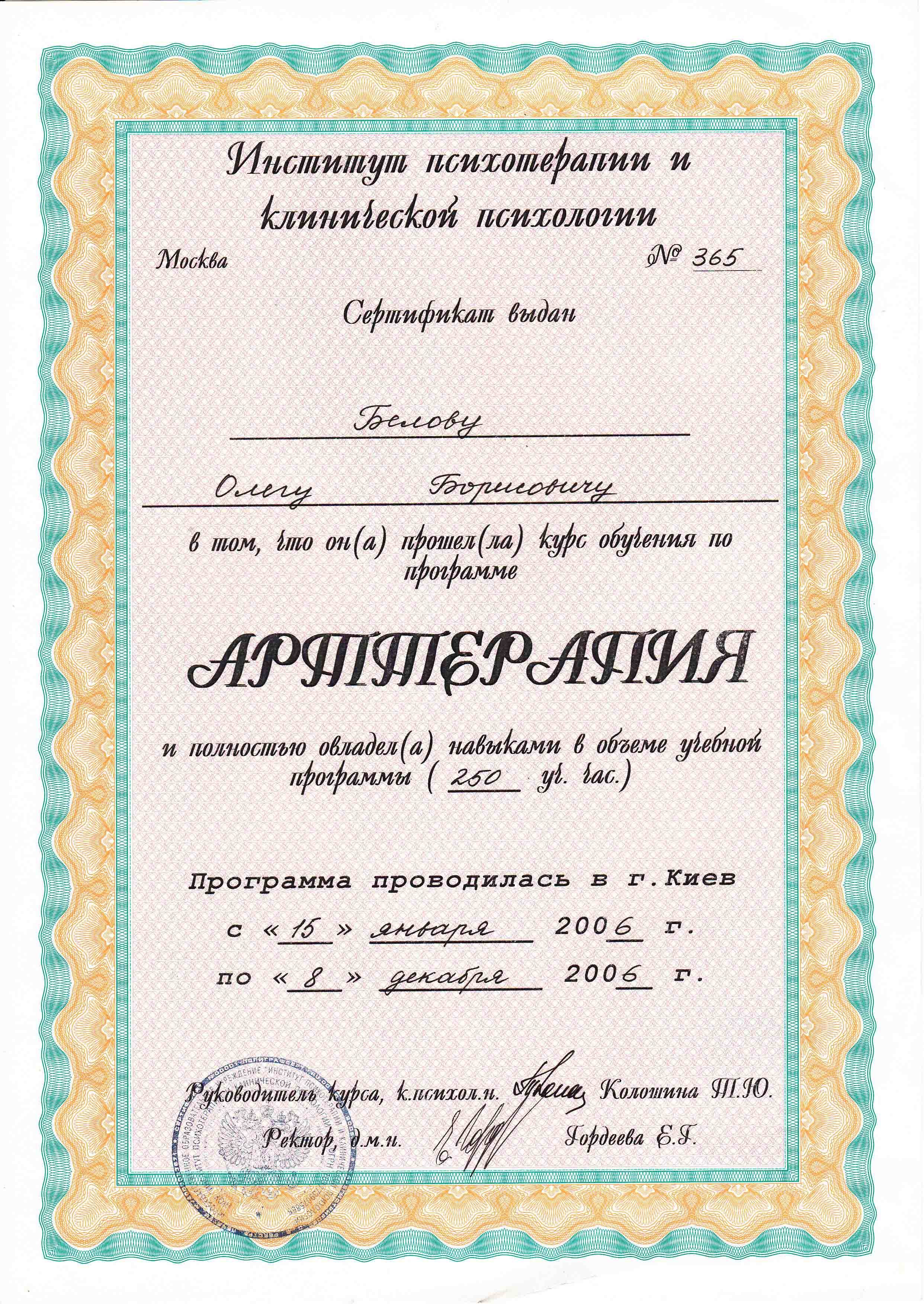 - Московский институт психотерапии и клинической психологии (2006) (специализация по АРТ–терапии и Психосинтезу)