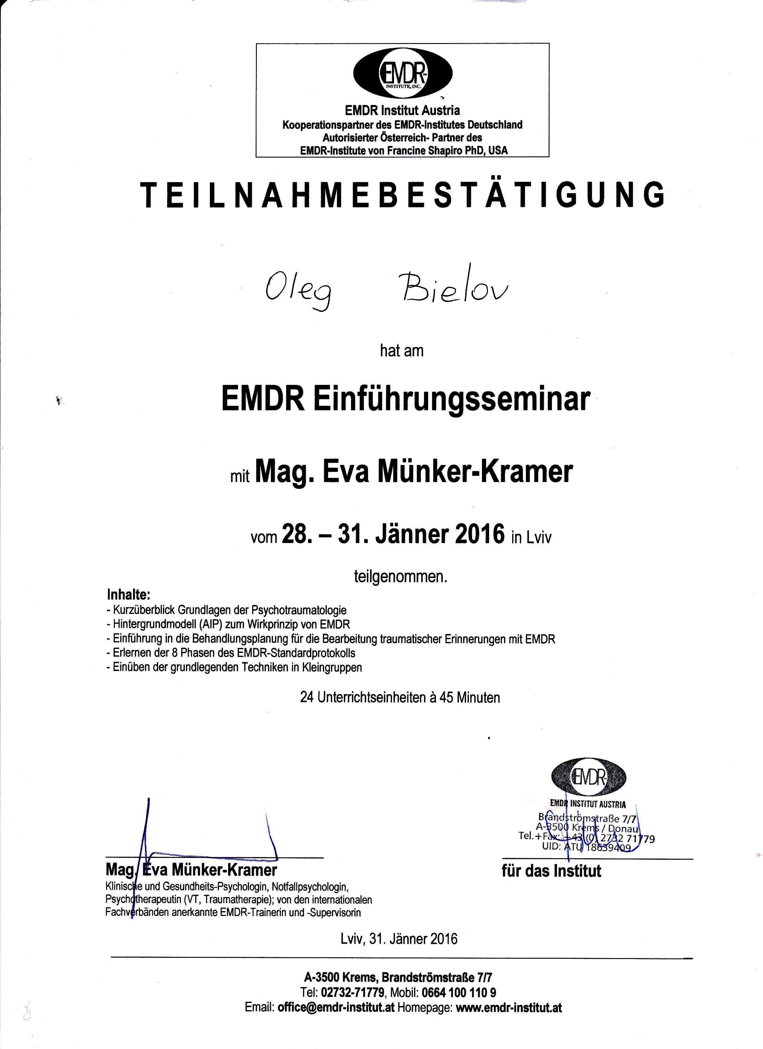 - Институт психичекого здоровья Украинского Католического Университета (2014 - 2016) - СХЕМА - психотерапии, EMDR и травматерапии, Mindfulness - терапии, психотерапия детей и подростков