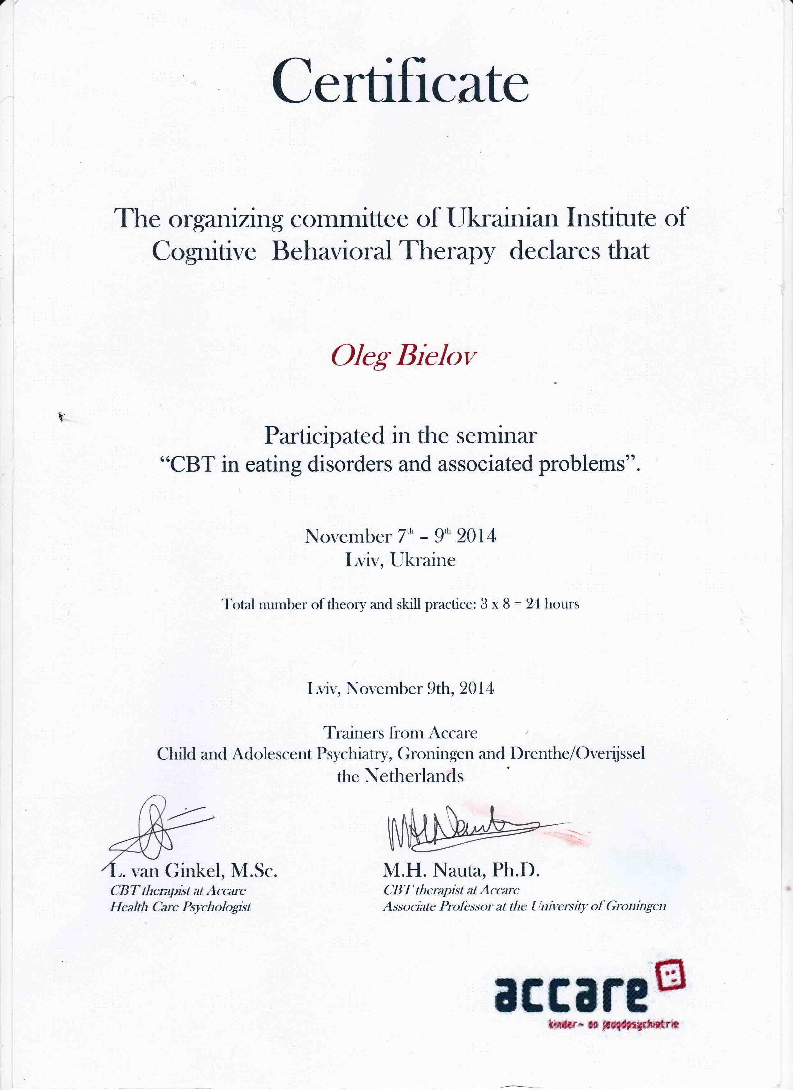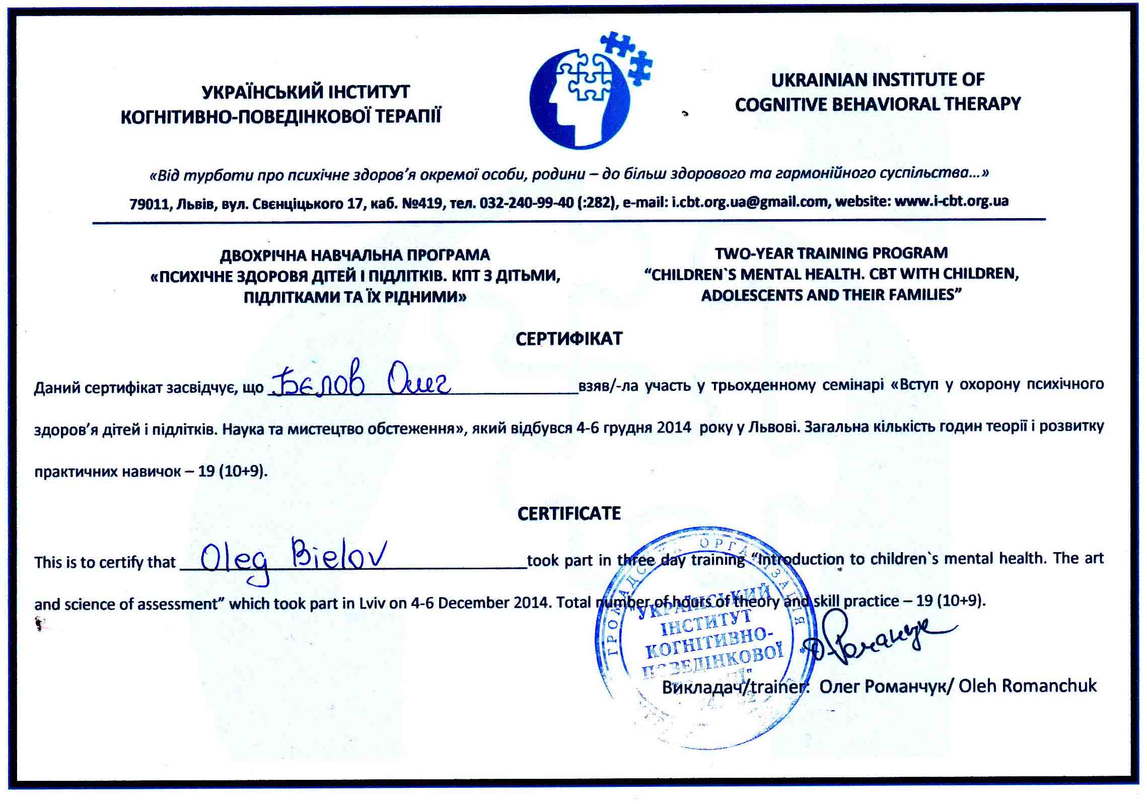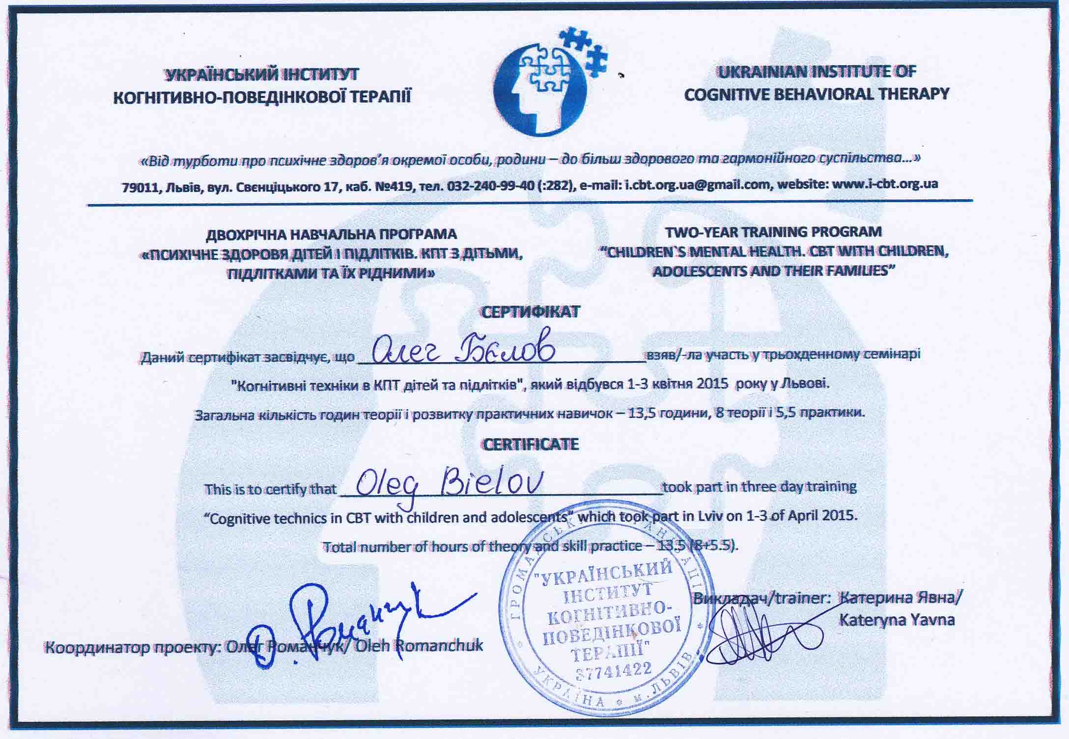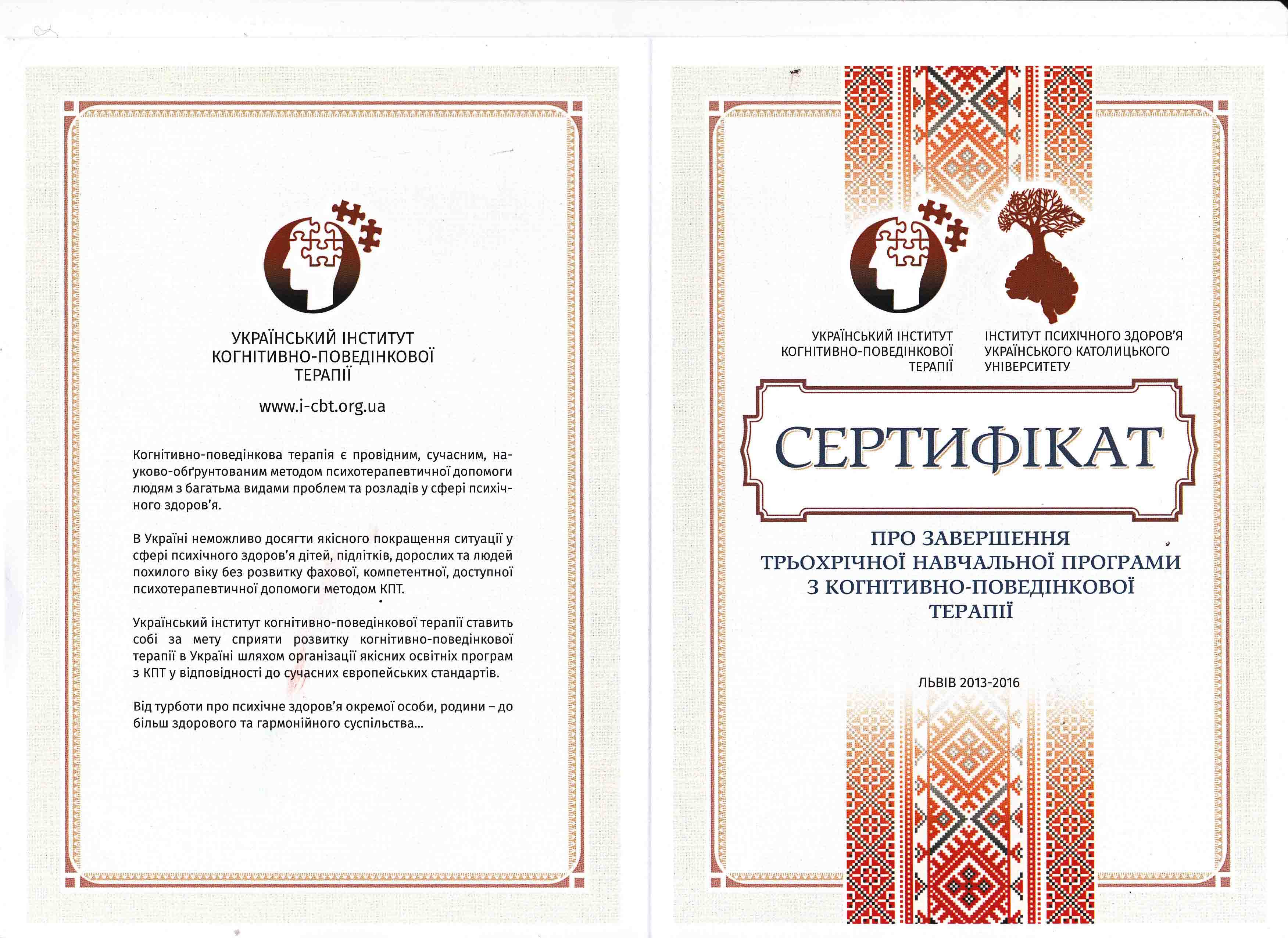 - Украинский институт когнитивно-поведенческой психотерапии (2013 – 2016) — когнитивно–поведенческая психотерапия